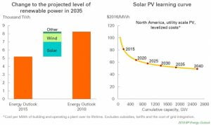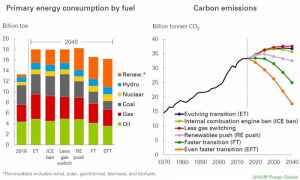 Базовий сценарій доповіді, який в цьому році названий BP “Evolving Transition” («Еволюційний Перехід») передбачає зростання викидів вуглецю на 10% до 2040 р., незважаючи на певне зрушення в бік більш чистих джерел енергії. Проте, в порівнянні з попередніми версіями, доповідь все-таки прогнозує більше зростання ВДЕ. У минулому році BP передбачала чотириразовий зростання поновлюваних джерел енергії (правда тоді горизонт дослідження був обмежений 2035 роком), в цей раз мова йде вже про п’ятикратне зростання (до 2040 року). При цьому автори очікують «особливо сильне зростання сонячної енергетики».На графіку (зліва) показано, як змінився прогноз вироблення відновлюваної енергетикою на 2035 рік у порівнянні з Прогнозом 2015 року.