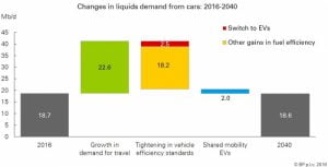 У новій доповіді автори суттєво підняли прогноз розвитку електричного транспорту. Так, якщо ще рік тому нафтовики вважали, що до 2035 року світовий автопарк буде складатися з електромобілів на 6%, то тепер BP прогнозує 15% електричних авто (більше 300 млн) до 2040 р. Проте аналітики нафтової компанії наполегливо стверджують, що споживання нафти в 2040 році буде більше, ніж сьогодні, незважаючи на швидкий розвиток електротранспорту. Воно виросте на 13 млн барелів на день «Твердження про те, що швидке зростання електромобілів призведе до колапсу попиту на нафту, не підтверджується основними розрахунками, навіть якщо це буде дійсно швидке зростання», – вважає Спенсер Дейл. Автомобілі в 2040 року будуть споживати приблизно стільки рідкого палива, скільки сьогодні.